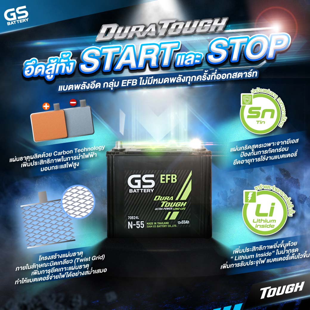 *GS MFX N-55 EFB (70B24L-MF) จุดเด่นของแบตเตอรี่รุ่นนี้ก็คือเป็นแบตเตอรี่ที่เราเรียกว่า EFB BATTERY ชนิด ตะกั่วหนากว่าแบตเตอรี่ทั่วไป กำลังสตาร์ทสูง (High CCA) แอมป์สูง 55 แอมป์ ไม่ต้องดูแลน้ำกลั่น แบตแรงคู่กับรถแรงครับ