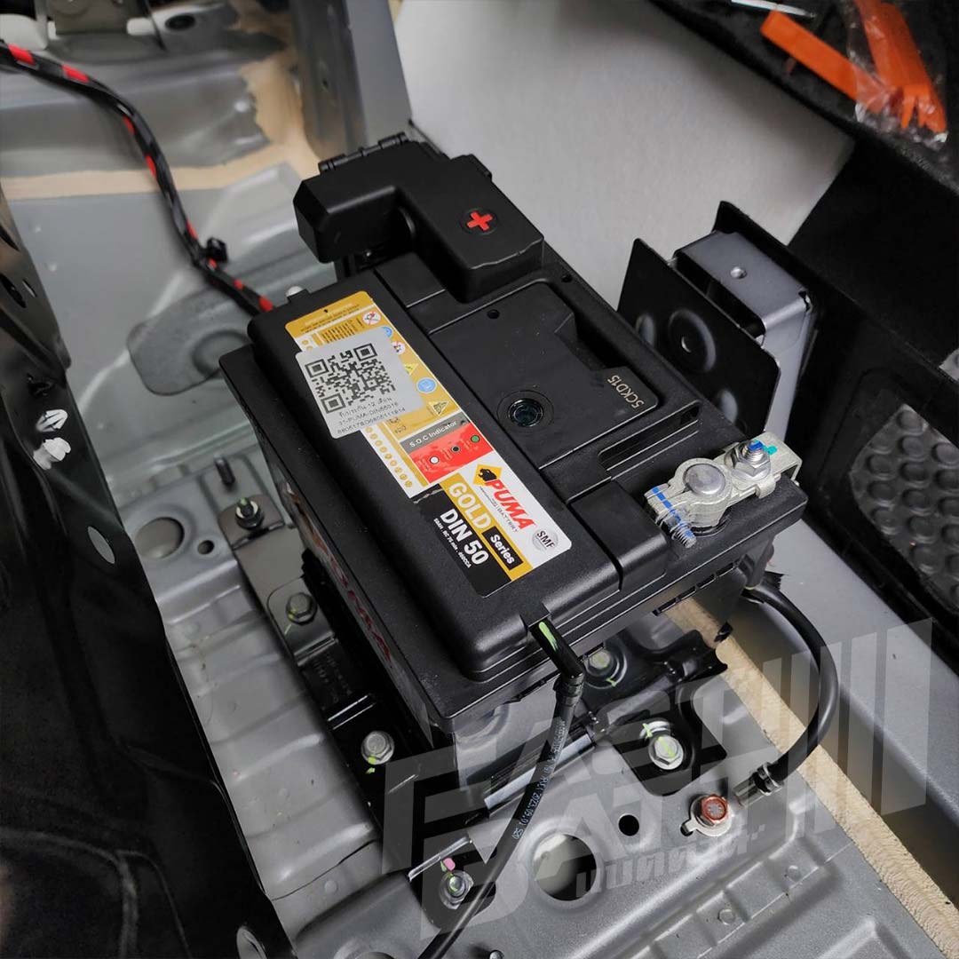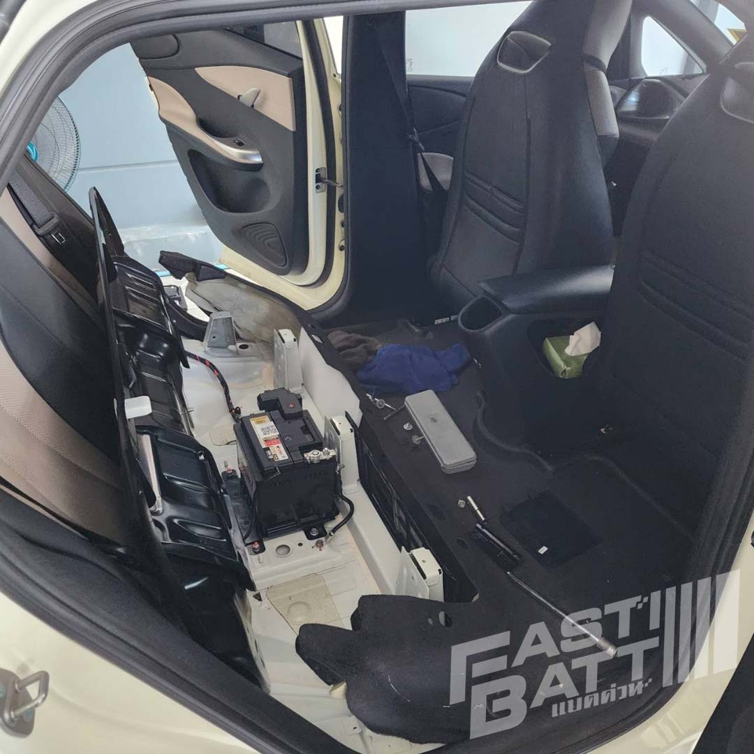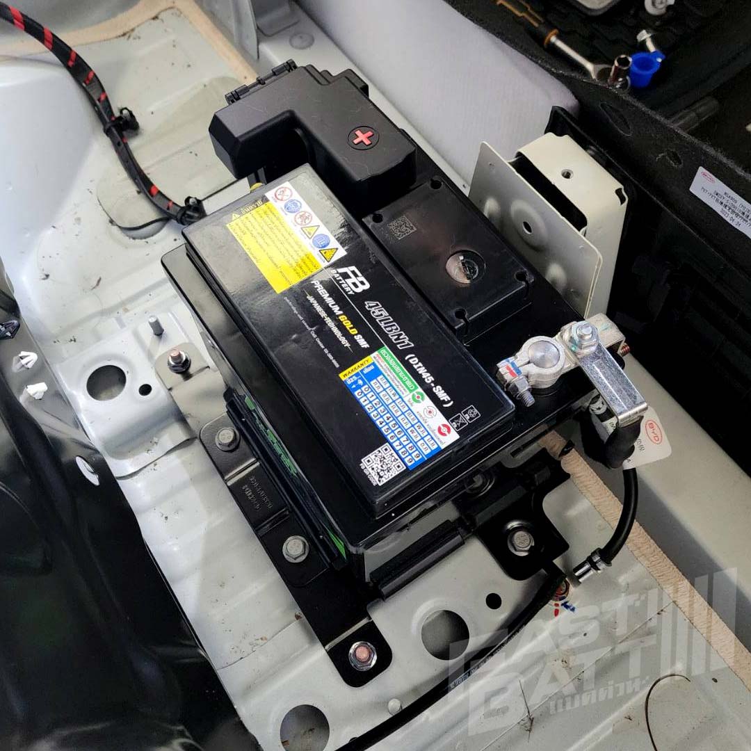 โดยแบตเตอรี่สำหรับสตาร์ทรถยนต์นั้นซ่อนอยู่ใต้เบาะคนนั่งด้านหลัง การเปลี่ยนแบตเตอรี่ต้องยกเบาะแถวหลังออกโดยเบาะแถวหลังนั้นค่อนข้างจะแน่น และถอดยากมากๆ บางครั้งอาจจะต้องช่วยกันดึงเบาะถึงสองคน หลังจากทำการถอดเบาะหลังเรียบร้อยแล้ว เราจะเจอชุดแผ่นเหล็กครอบรองเบาะที่มีชุดน๊อตไม่ต่ำกว่า 12 ตัวในส่วนนี้ก็ใช้เวลาเช่นกันครับ