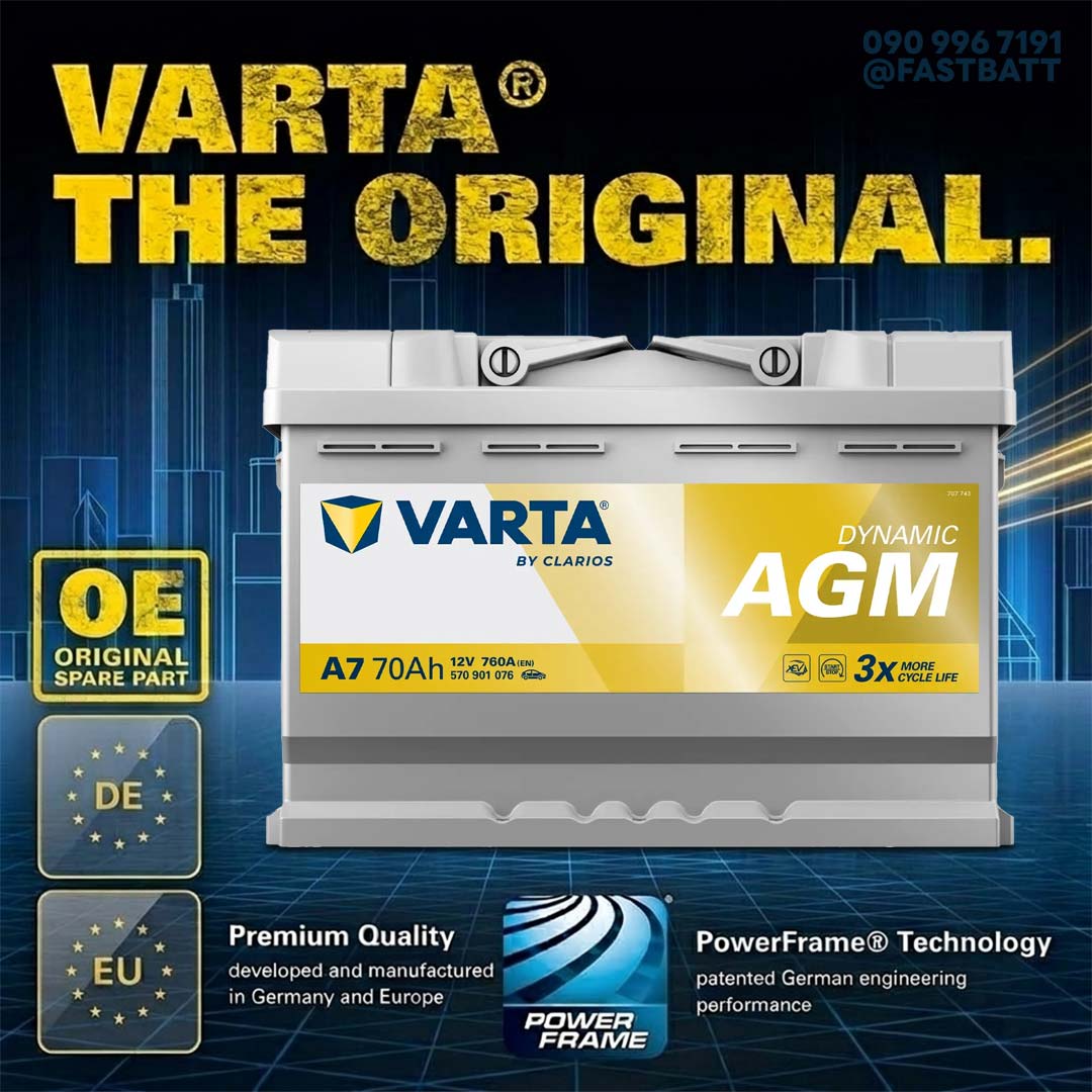 VARTA Dynamic AGM (เกรดเยอรมัน) Made in EU แบตเตอรี่เกรด AGM สเปคเดียวกันกับแบตเตอรี่ที่มาพร้อมกับรถยนต์ จุดเด่นคือเทคโนโลยีโครงกริด PowerFrame® ที่ทนทาน และมีประสิทธิภาพสูงอย่างแท้จริงอันดับ 1 ของโลก มีกำลังสตาร์ทที่สูง กำลังไฟเสถียร คลายประจุได้ลึก ทนทานใช้งานยาวนาน ไม่ต้องดูแลน้ำกลั่นตลอดอายุการใช้งาน ราคาถูกกว่าศูนย์บริการ